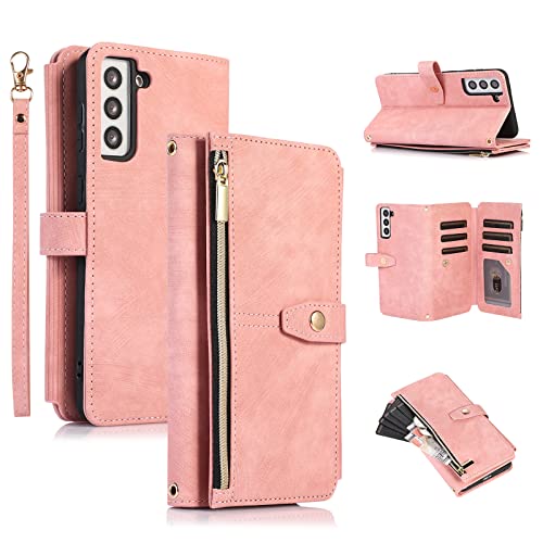 UEEBAI Case for Samsung Galaxy S21 FE 5G, 9 Card Slots Retro Leather Wallet Shockproof Flip Cover with Hand Strap Card Slots Zipper Pocket Kickstand Handbag Magnetic Closure - Retro Pink