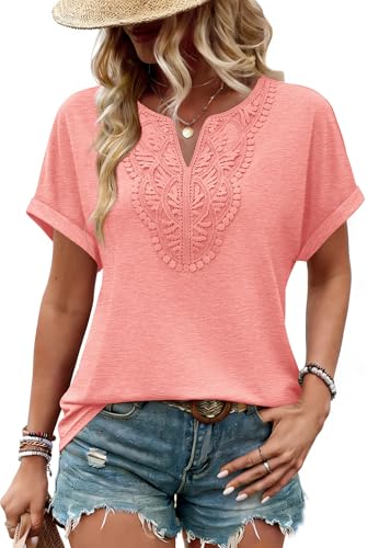 Spring Tops for Women Trendy 2026 V Neck T Shirts Dressy Casual Boho Blouses Summer Clothes Lightweight Tunic for Leggings Coral M