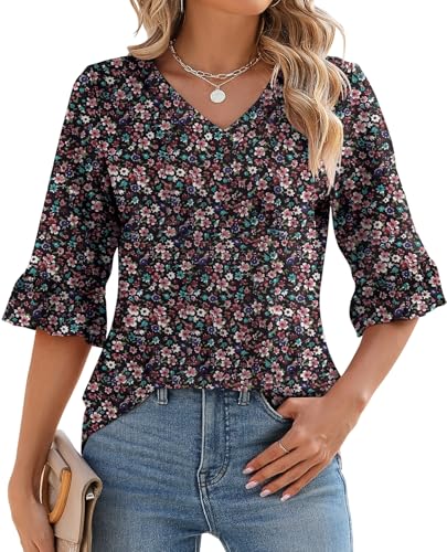 LOMON 3/4 Sleeve Blouses for Women 2025 Summer Loose V-Neck Tops Dressy Casual Spring Ruffle Bell Sleeve T-Shirts Textured Tunic (Floral 3,Medium)