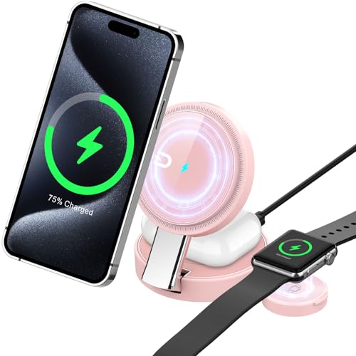 3 in 1 Wireless Charging Station for Apple MagSafe Charger,Foldable 15W Fast Charging Magnetic Wireless Charger Stand,Travel Charger for iPhone 17 16 15 14 13 12,Apple Watch,AirPods,Samsung (Pink)