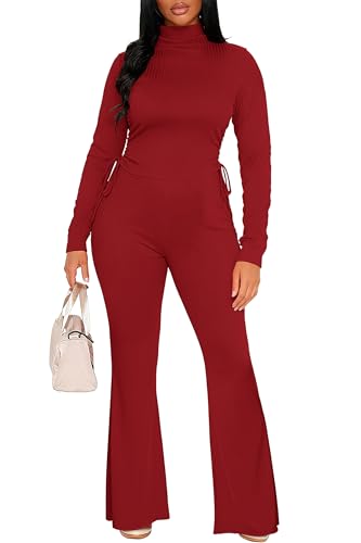 CLOCOR Casual 2 Piece Outfits for Women - Fall Ribbed Long Sleeve Crop Top Flared Pants Tracksuits Matching Lounge Set