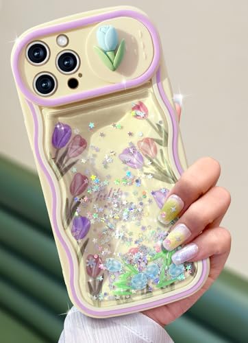 Toycamp for iPhone 13 Pro Max Case - Women Girls Cute Cover Flower Tulip with Sliding Camera Cover Girly Glitter Pretty Kawaii Teens Design Flowing Liquid Quicksand Phone Case for 13 Pro Max 6.7"
