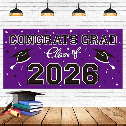 2026 Graduation Party Plastic Backdrop - 65" x 32.7" Congrats Grad Banner in Purple, Large Class of 2026 Decorations, Photography & Grad Party Supplies