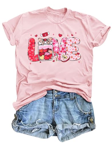 LUKYCILD Valentines Shirt Women Love Heart T-Shirts Funny Love Graphic Tee Casual Crewneck Short Sleeve Tops B-pink