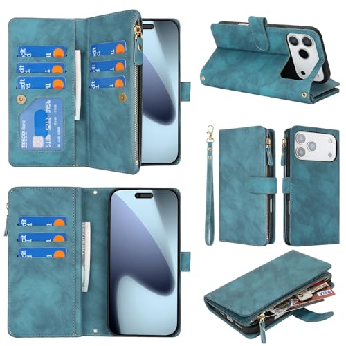 Jaorty Wallet Case Compatible with iPhone 17 Pro with Wrist Strap,2025 Release Purse for Women Men,[9 Card Slots] Card Holder Zipper Cash Pocket Magnetic Leather Cover,6.3 inch Blue