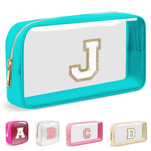 Small Clear Personalized Initial Makeup Bag,Nylon Preppy A-Z Chenille Letter Patch Cosmetic Pouch Beach Toiletry Bag,Waterproof Zipper Travel Purse Storage Bag Organizer for Women Girls(Cyan-White J)