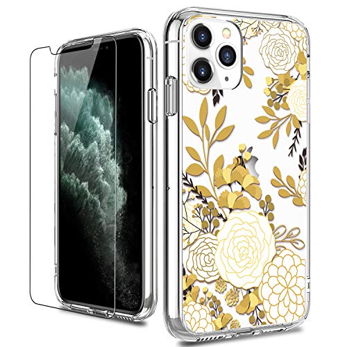 LUHOURI Designed for iPhone 11 Pro Max Case with Screen Protector - Crystal Acrylic Clear for Women and Girls - Slim Fit Protective Phone Cover 6.5" - Champagne Floral Flower