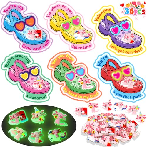 TSDATOWR Valentines Day Cards for Kids School - 36 Pcs Valentines Gifts for Kids with Axolotl Shoe Charms Bulk, Funny Valentine Exchange Cards for Boys Girls Toddler Class Classroom Gift Party Favors
