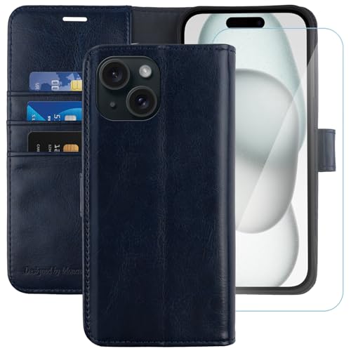 MONASAY Wallet Case Compatible for iPhone 15 5G,[Glass Screen Protector Included] [RFID Blocking] Flip Folio Leather Cell Phone Cover with Credit Card Holder, 6.1-inch, Blue
