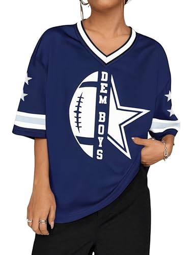 Jersey Shirts for Women Football Fans Tshirt Game Day Graphic Tees Sunday Funday Shirts V Neck Y2k Streetwear Tops Cowboy Blue