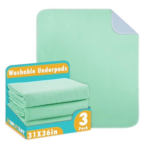 Bunlitent Washable Underpads, 31" x 36", 3 Pack, Green, Heavy Absorbency Reusable Bedwetting Incontinence Pads for Kids, Adults, Elderly, and Pets - Waterproof Protective Pad for Bed, Couch
