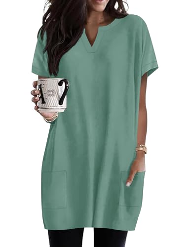 Rapbin Short Sleeve T Shirt Women Long Tunic Tops for Leggings Summer Tops for Women V Neck Casual Blouses Boho Green XL
