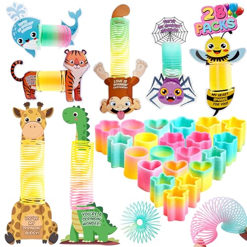 Valentines Day Cards for Kids School Classroom Exchange, 28 Packs Coil Rainbow Springs Toy with Animal Greeting Cards, Stress Relief Coil Toys with 28 for Valentines Prizes Game Prizes, Yellow