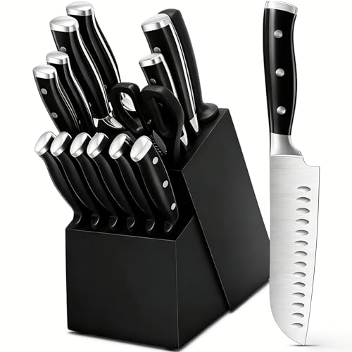 Knife Set, 15 Piece Premium Kitchen Knife Block Set, Razor-Sharp, High Carbon Stainless Steel Chef Knife, Ergonomic Forged Triple Rivet Handle, Black Sharp Knife Set for Kitchen, Dishwasher Safe