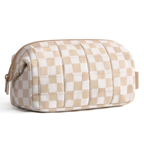 BAGSMART Makeup Bag Travel Toiletry Bag, Puffy Padded Make Up Bags for Women Makeup Organizer Case, Wide-open Pouch Purse Travel Essentials Toiletries Accessories Brushes, Checkered Khaki