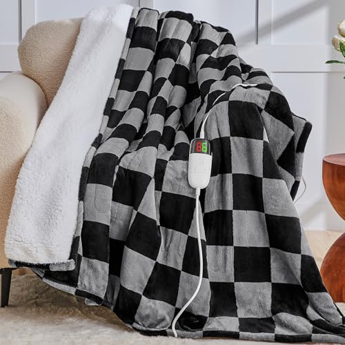 Heated Electric Blanketc Throw, 50X60 Heating Blanket with 10 Heat Level & 8 Hours Auto Off for Lap, Black Gray Checkered Plaid Soft Sherpa Blankets Warmer Gifts for Couch Grandma Women Adults