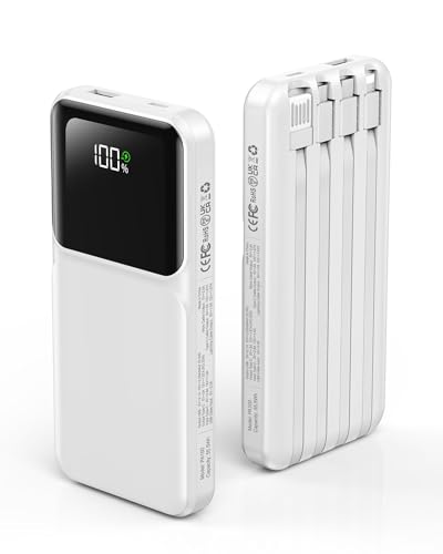 RONEGN Portable Charger with Built in Cable - Power Bank Fast Charging USB C LED Display 10000mah Battery Pack 5 Outputs & 3 Inputs for Travel Essentials iPhone Samsung Android Phones Tablets Grey