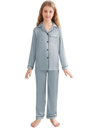 Veseacky Kids Winter Pajama Set Soft Satin Button Top and Pj Long 2-Pieces Sleepwears Set (Grey,8y 9y)
