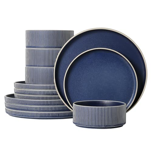 ALOFMO Dinnerware Set Service for 4, 12-Piece Ceramic Plates and Bowls Set, Chip & Scratch Resistant, Microwave and Dishwasher Safe, Modern Minimalist Tableware for Everyday Use, Matte Blue