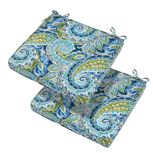 Magpie Fabrics Indoor Outdoor Waterproof Square Chair Cushion, 18" x 18" x 2.5", 2 Pack, Water Resistant Seat Cushions, for Patio Garden Office, Paisley Lapis Green