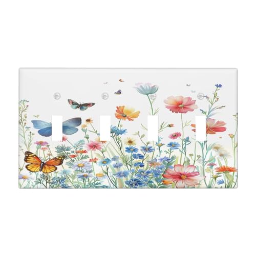 OILbiexn Light Switch Cover Vintage Watercolor Wildflowers Butterfly Floral 4 Gang Switch Plate Quad Toggle Wall Plates Decorative Switchplate Electrical Outlet Cover for Bathroom Bedroom Decor