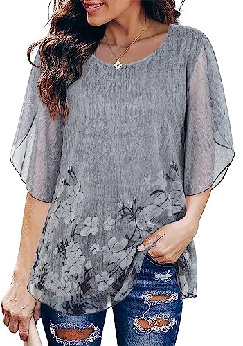 SeSe Code Plus Size Womens Tops Dressy Casual Fall Chiffon Blouses for Women Elegant Floral Top Flutter Sleeve Crew Neck Shirts Formal Lightweight Pullover Grey 3XL