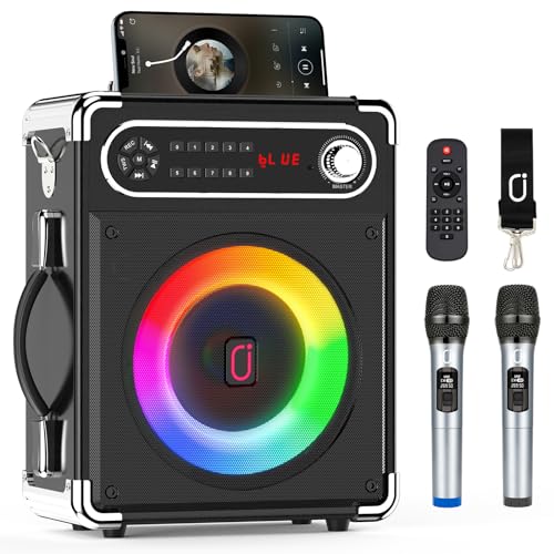JAUYXIAN Bluetooth Speaker with Two Wireless Microphones, Outdoor Speaker with Subwoofer/Tweeter, Portable PA Speaker System with Remote Control, Discol Lights, FM, REC for Home, Party