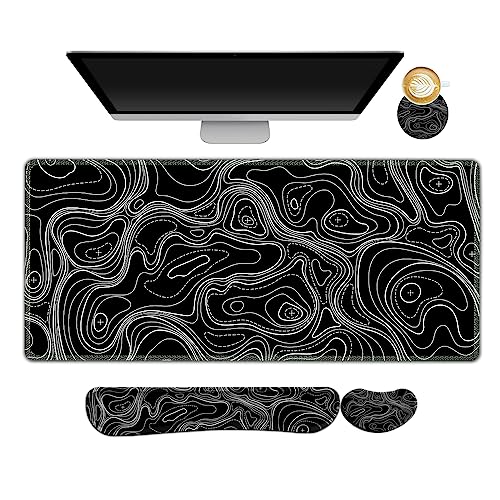 AIMSA Keyboard Mouse Pad Set, Large Gaming Mouse Pad +Wrist Rest Mouse Pad +Keyboard Wrist Support +Coaster, 35x15.7 inch Extended Desk Mat for Easy Typing Pain Relief (Black Topographic)