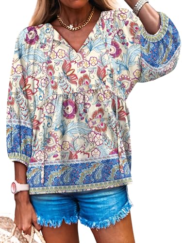 Caracilia Womens 3/4 Sleeve Blouse V Neck Boho Dress Tops Flowy Casual Dressy Shirts Beach Vacation Clothes Spring Outfits Blue Purple Floral Medium