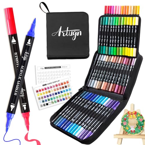 Artugn 60 Colors Acrylic Paint Pens, Dual Tip Pens With Fine Tip and Brush Tip for Rock Painting, Ceramic, Wood, Plastic, Calligraphy, Scrapbooking, Brush Lettering, Card Making, DIY Crafts