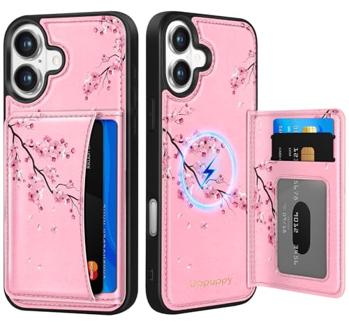 Uppuppy for iPhone 16 Wallet Case - Fits 4 Card, Compatible with MagSafe Women Girls Cute Aesthetic Design Leather Credit Card Holder Phone Cover for Apple 16, Peach Blossom
