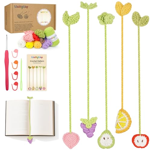 WaldyWop Crochet Kit for Beginners: 5 PCS Fruit Bookmarks Crochet Kits w/ 40% Extra Yarn, Accessories - Easy Video Tutorials & Instructions for Starter Adults - DIY Christmas Gift Set for Her Women