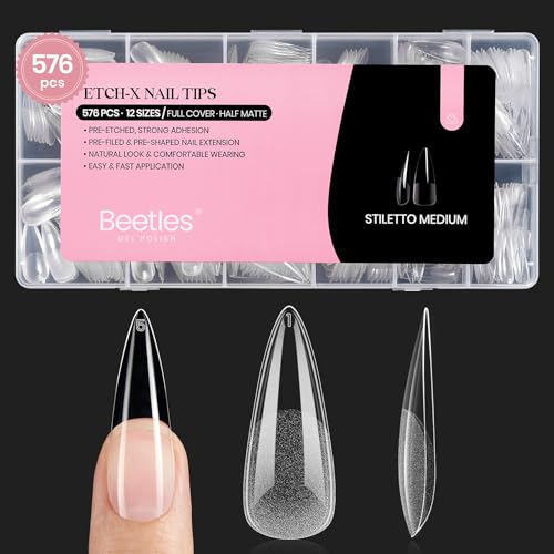 Beetles Gel Nail Tips Etch-X, Stiletto Medium, 576Pcs 12 Sizes, Pre-Etched Half Matte Full Cover Soft Acrylic False Nail Tips Easy DIY Press On Nail Extensions Salon Gift for Women