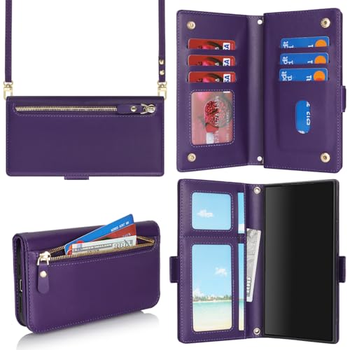 SunYoo for Samsung Galaxy S23 Ultra Case Wallet with Card Holder for Women,S23 Ultra Case with Strap Crossbody Lanyard,PU Leather Shockproof Stand Zipper Pocket Flip Phone Case-Dark Purple