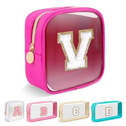 Mini Clear Personalized Initial Makeup Bag,Small Nylon Waterproof Zip Beach Cosmetic Pouch,Preppy A-Z Chenille Letter Patch Cute Coin Purse Travel Toiletry Bag Car Pack Bag for Women(Hot Pink-White V)