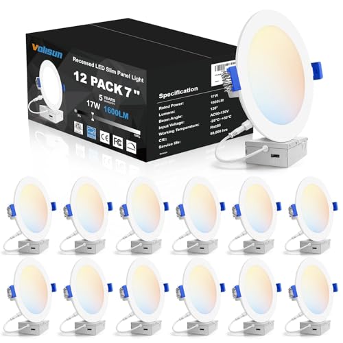 VOLISUN 12 Pack 7 inch Recessed Lighting, 5CCT LED Recessed Light with Junction Box, 2700K-5000K Selectable, Dimmable Canless Wafer Downlight, LED Ceiling Light ETL Certificated