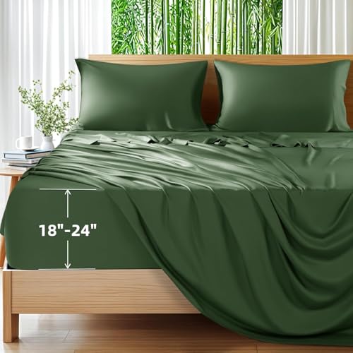 Shilucheng 100% Viscose Derived from Bamboo_Sheets, Extra Deep Pocket Sheets Fits 18"-24" Thick Mattress, Cooling & Breathable Bed Sheets 4Pcs, Hotel Silky Bedding Set (King,Olive)