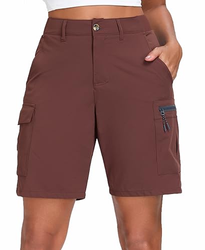 Oalka Women's Hiking Cargo Shorts Bermuda Lightweight Golf Camping 9" Long Shorts with Pockets Quick Dry Coffee S