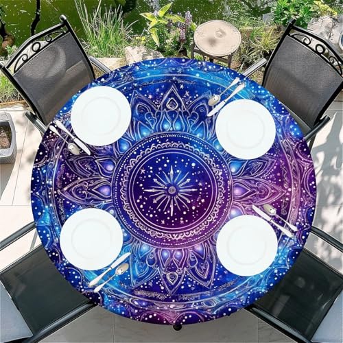 Yesad Round Table Cover for Round Tables 36"-70", Fitted Tablecloth with Elastic for Indoor Outdoor Party Holiday, 60inch, Blue and Purple Mandala