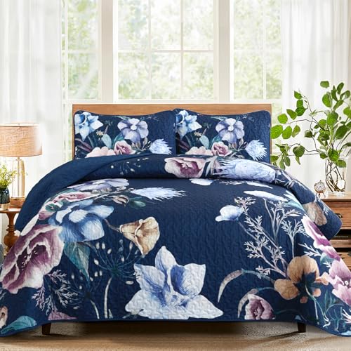 Drucon Blue Floral Quilt Set Queen Size 3 Pieces Blue Botanical Flower Quilt Coverlet Set Soft Microfiber Lightweight Quilted Bedspread for All Season 90"x96"