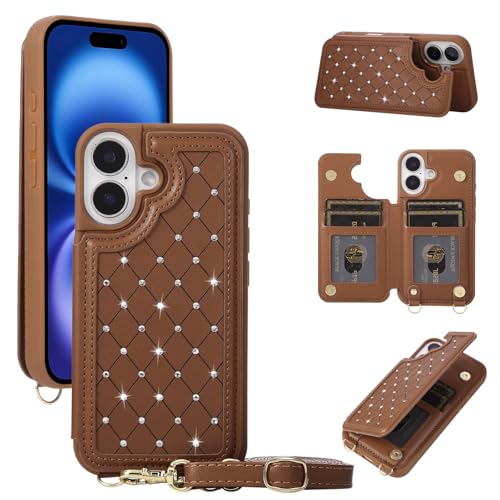 KYFSJPT Crossbody Wallet Case for iPhone 17(6.3") with Detachable Strap - PU Leather Flip Folio with Card Slots & RFID Blocking, Sparkling Diamond Accents-Brown