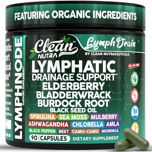 Organic Lymphatic Drainage Supplements | Elderberry Bladderwrack Burdock Root Black Seed Oil Spirulina Sea Moss Ashwagandha Chlorella Amla Beet Moringa Chlorophyll Lymph System Capsules By Clean Nutra
