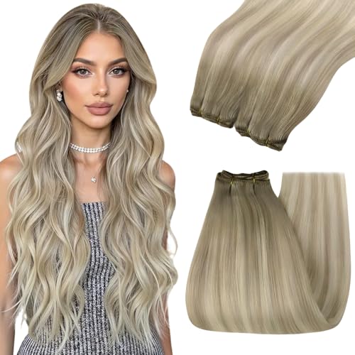 YoungSee Weft Hair Extensions Blonde Highlight Human Hair Extensions Sew in Dark Ash Blonde Highlighted Light Blonde Sew in Weft Hair Extensions Human Hair for Women 18Inch 100G