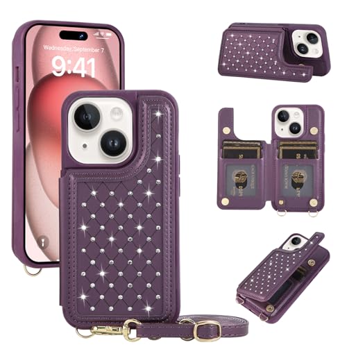 Jcxtrombulous for iPhone 15 Wallet Case with Card Holder Slots and Strap, RFID Blocking Magnetic Flip Folio Cover, Crossbody Purse Protection Case with Kickstand,Deep Purple Diamond