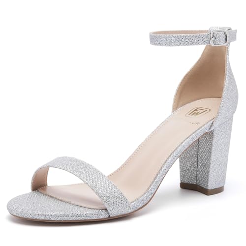 FW FRAN WILLOR Women Open Toe Low Chunky Short Silver Glitter Heels Ankle Strap Block Heel Sandals Party Dress Wedding Pump Shoes