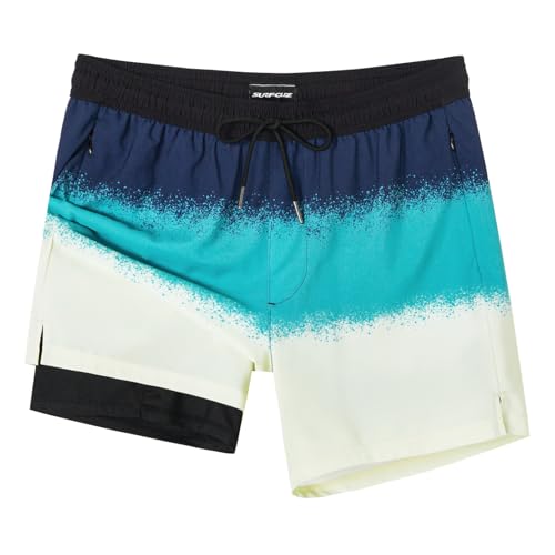 SURF CUZ Mens Swim Trunks with Compression Liner 5" Swim Shorts Quick Dry Bathing Suit Swimming Trunks Zipper Pockets Ink Blue Gradient Large