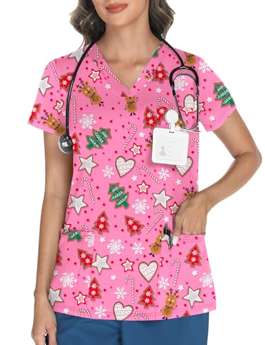 LOMON Scrubs for Women V Neck Chrismas Scrub Tops Short Sleeve Print Scrub Shirts Nurse Uniform with 3 Pockets