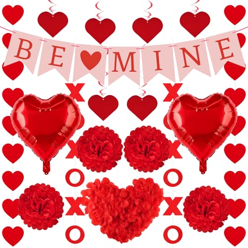 Valentines Day Decoration Set, Heart XO Garlands Hanging Heart Swirls BE MINE Banner Hearts Balloons Red Rose Petals Decor for Home Classroom Office Wedding Party
