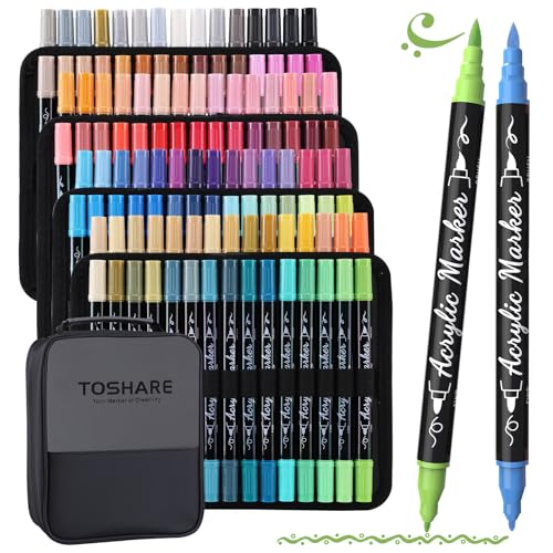 TOSHARE 120 Colors Acrylic Paint Markers Waterproof Dual Tip Acrylic Paint Pens with Brush & Fine Tip Professional Marker Set Scrapbook Markers for Paper Rock Wood Fabric Glass Ceramic and DIY Crafts