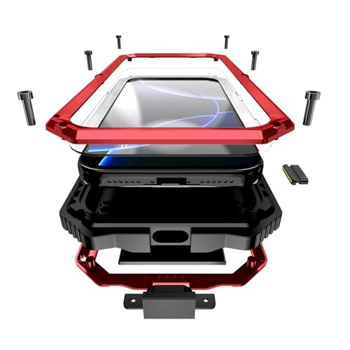 Simicoo Military Metal Heavy Duty Case for iPhone 17 Pro Max, Drop Protection Rugged Defender Metal Bumper Screws Case with Stand Gorilla Glass Camera Cover Full Body Dustproof Protective Cover Red